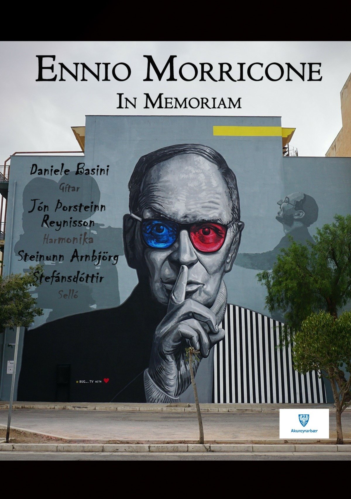Daniele Basini, Jón Þorsteinn Reynisson og Steinunn Arnbjörg Stefánsdóttir flytja tónlist kvikmyndatónskáldsins ástsæla Ennio Morricone, í tilefni af 97 ára afmæli hans. Þau leika tónlist úr m.a. Nuovo Cinema Paradiso, Once upon a time in America, og nokkrum góðum spaghettí-vestrum.