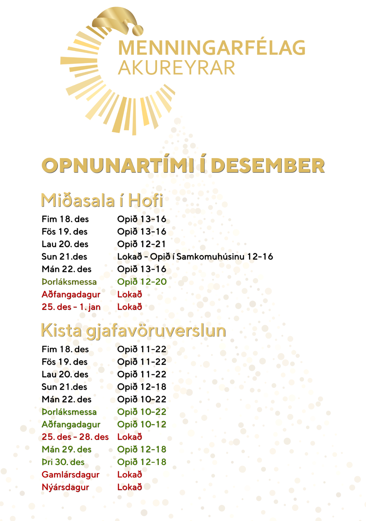 Nú styttist í jól og áramót og hér til hliðar má sjá opnunartíma í miðasölunni í Hofi og hjá Kistu yfir seinustu dagana í desember.